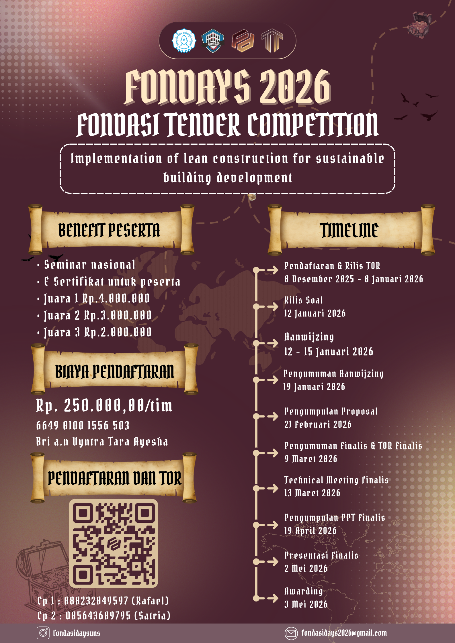 Fondasi Tender Competition merupakan kompetisi untuk menyusun dokumen penawaran pada pengadaan jasa konstruksi dengan tema Implementation of lean construction for sustainable building development. Hal tersebut menerapkan ilmu manajemen konstruksi. Suatu proyek konstruksi akan berjalan dengan lancar apabila didukung oleh manajerial yang baik dan tepat dengan memanfaatkan sumber daya yang ada secara efektif dan efisien sehingga tujuan proyek akan tercapai secara optimal. Dengan adanya kompetisi ini, mahasiswa diharapkan dapat berinovasi dalam rangka mengefisiensi sumber daya dalam konstruksi. Pada kompetisi ini, peserta akan mendapat gambar bestek untuk dijadikan acuan penyusunan dokumen penawaran. Dalam proses pengerjaan lomba dilaksanakan di universitas masing-masing yang nantinya akan diambil 5 tim finalis untuk melaksanakan presentasi secara luring di Universitas Sebelas Maret